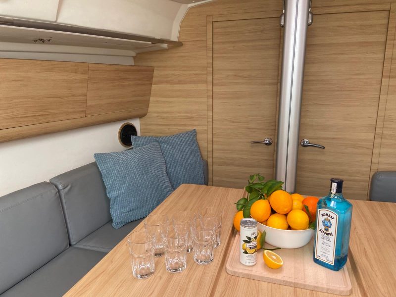 There is also a holding tank for wastewater. The saloon seats are comfortable and long enough to be good berths. The light-coloured varnished woodwork is warm and modern. Two large opening hatches and several opening ports provide good light and ventilation.